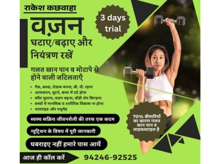 Join our 3-day trial program to reduce or gain weight safely and naturally. Learn how proper nutrition and an active lifestyle can prevent common issues caused by unhealthy eating such as gas, acidity, high BP, joint pain, breathing problems, thyroid and diabetes. We guide you step-by-step with complete information on diet and fitness so you can stay fit, energetic and confident. Don’t worry — just reach out to us and start your journey towards a healthy body and mind today!